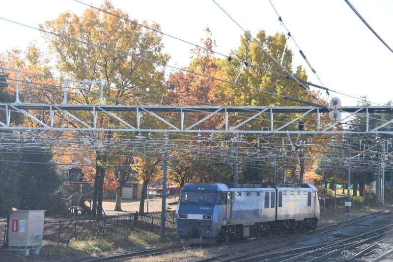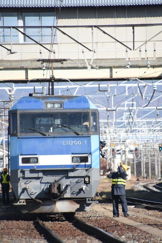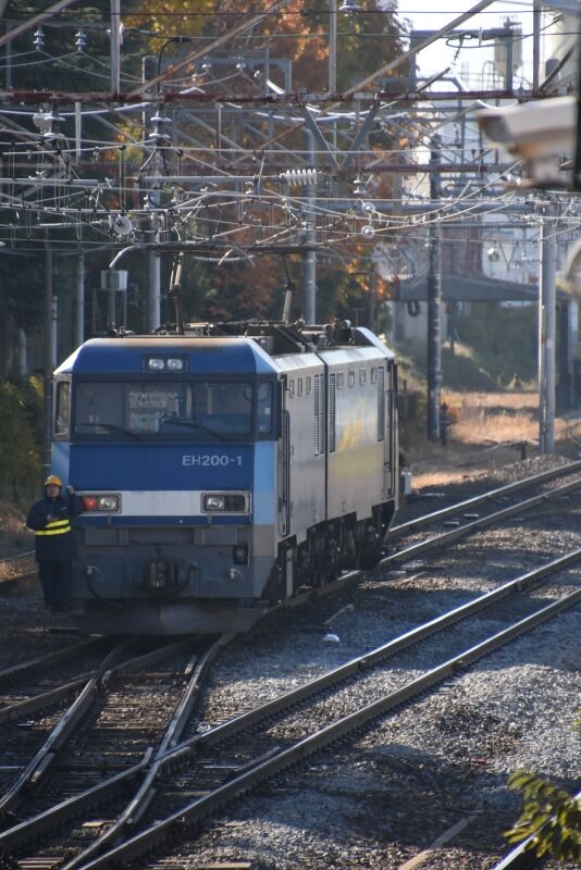 写真4枚目は、操車係に誘導されて、ようやく側線から本線を横断して行く、EH200-1号機です。