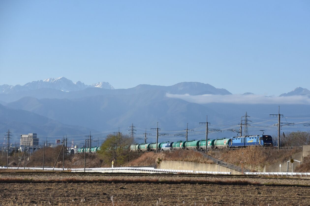 写真1枚目は、アルプスをバックに、東線貨物2084レ EH200-21号機が緑タキを15両牽いてです。
