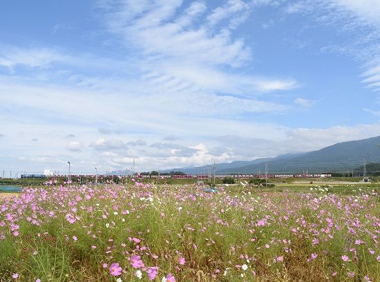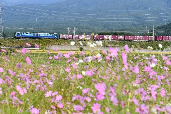 写真2枚目は、ワイドにして秋桜越しに、東線貨物2083レの編成です。