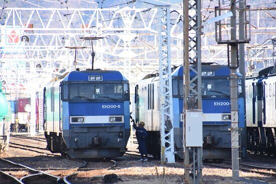 写真4枚目は、機回し中のEH200-6号機 が本線を横断する所を撮影です。