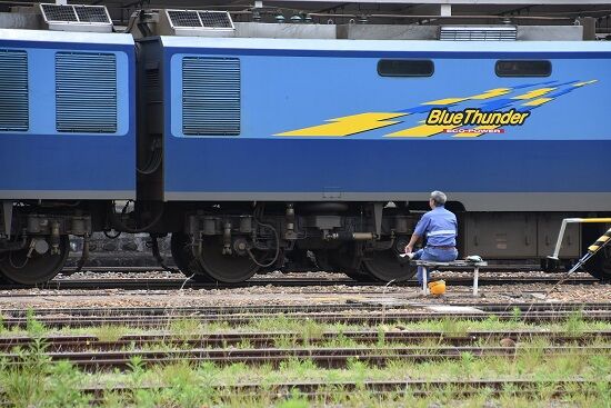 写真2枚目は、EH200-12号機が進む先には、誘導員さんが赤く目印が付いた棒みたいなものを、左右に振り誘導しています。止まる時は、棒を両手に持ち、停止の合図をしていました。