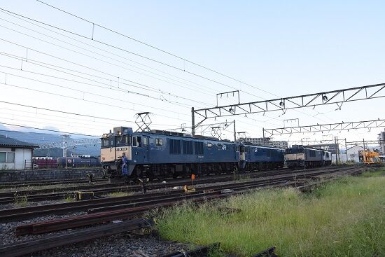 写真1枚目は、出区前の点検中の篠ノ井線8467レに充当するEF64がライトと尾灯を点灯しています。こちら側は次位側ですので、本線では見られないシーンです。