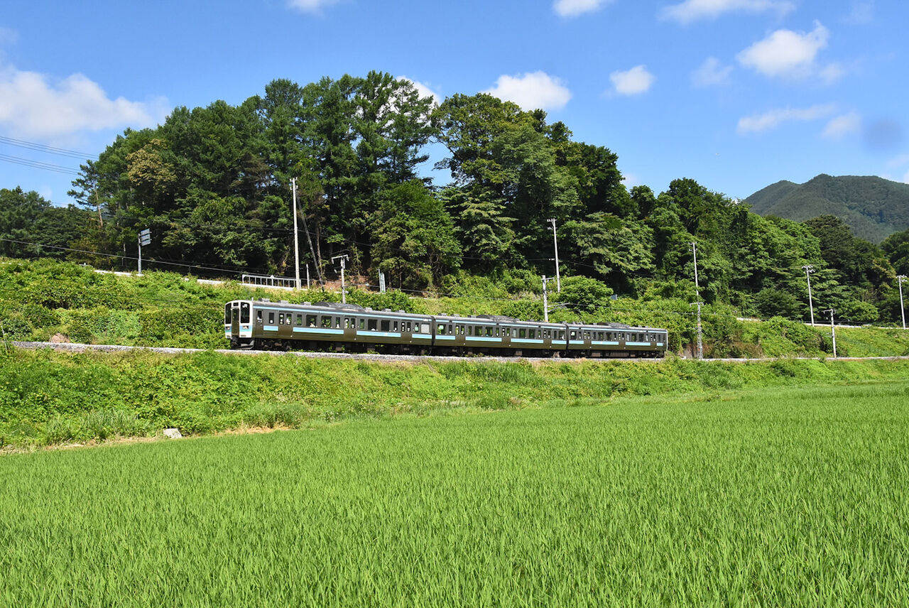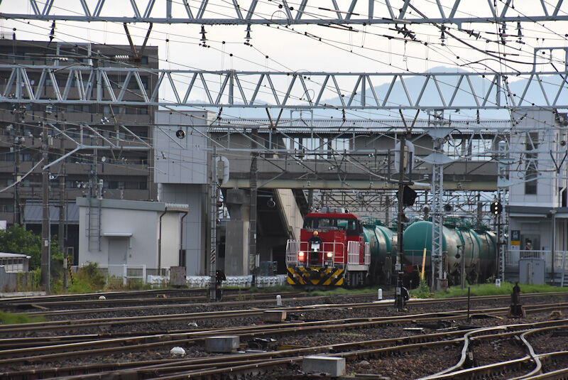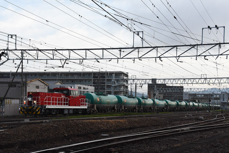 写真3枚目は、篠ノ井線貨物2085レの緑タキのお尻と、南松本駅を発車するHD300-10号機ですが、緑タキの荷が重いのか、モーターを唸らせての発車です。