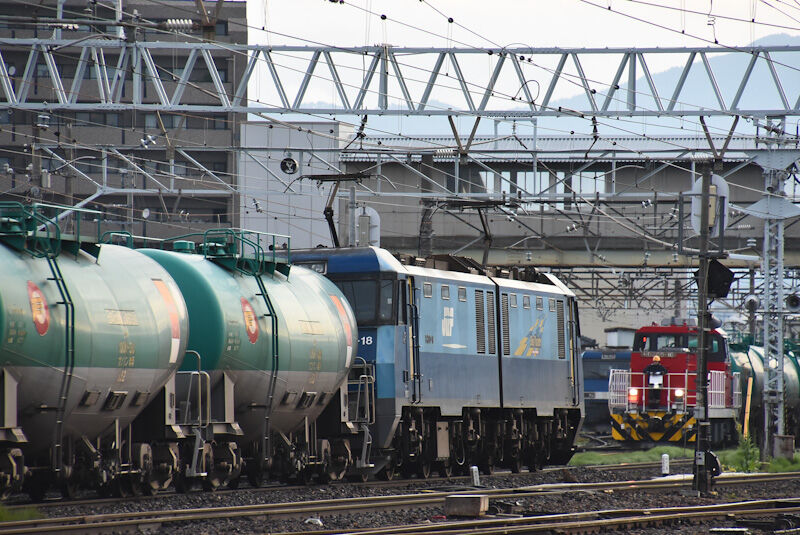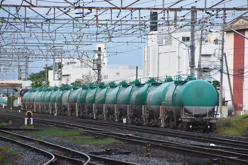 写真1枚目は、南松本駅を通過中の篠ノ井線貨物2085レ EH200-18号機です。この日は、緑タキを17両牽いていました。