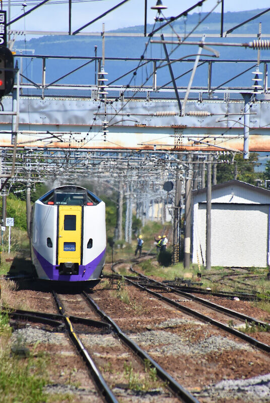 写真5枚目は、五稜郭駅を発車して行くキハ261系1000番台 「北斗7号」を後撃ちすると、遠くの線路では保線工事??をしている姿が見えます。