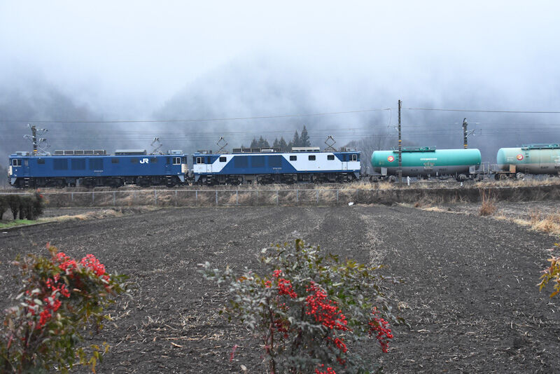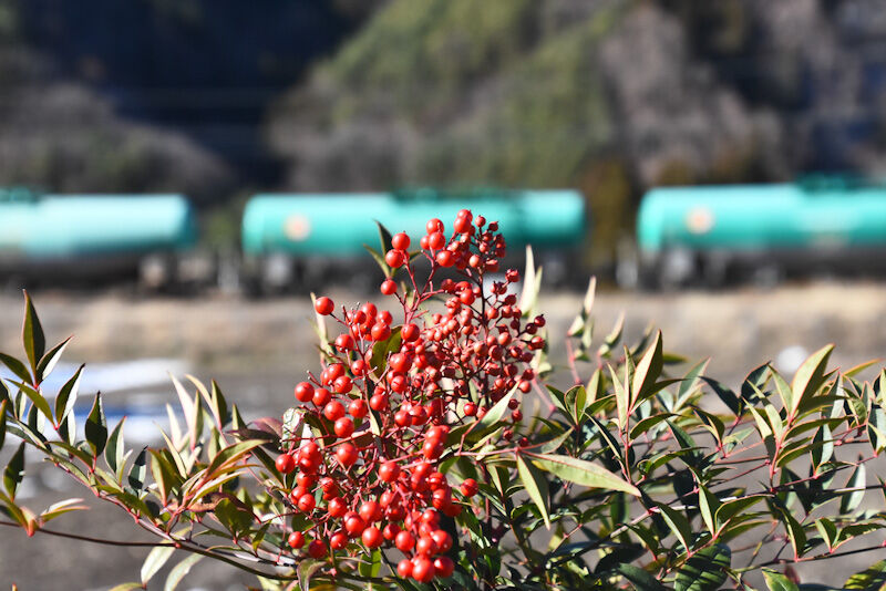 その後は、西線貨物8084レを1発目は、塩尻→洗馬間のストレートにて撮影。2発目は、洗馬→日出塩間にて南天と絡めて撮影して、本日の撮影は終了です。