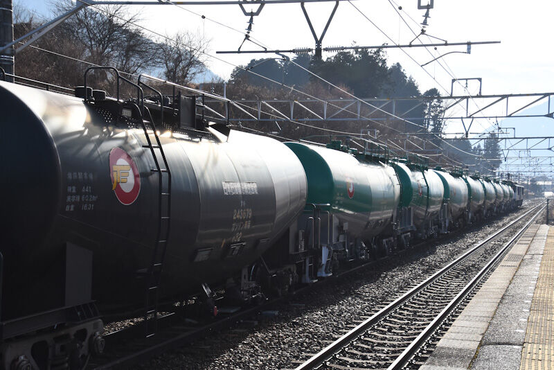 ①.西線貨物6088レ EH200-10号機が緑タキ18両を牽いてです。