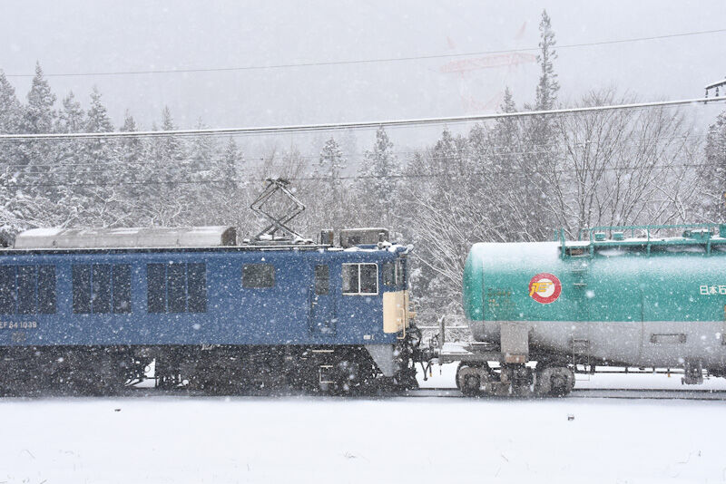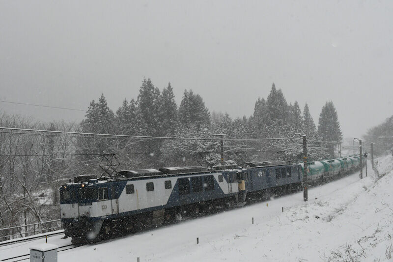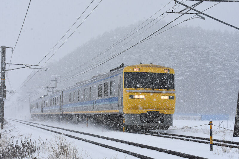 写真4枚目は、場所を移動して、本山のカーブにて、雪が激しく降る中を、西線貨物8084レが通過した後、直ぐに来る829M 211系です。