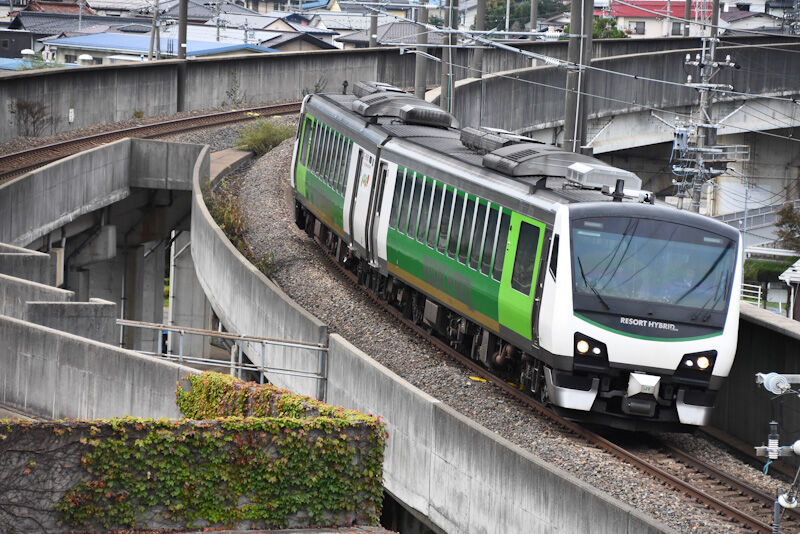 写真1枚目は、辰野駅にてバカ停車をしていた試9420M E491系 East i-Eがミュージックホーンを鳴らして、ハイビームで発車です。