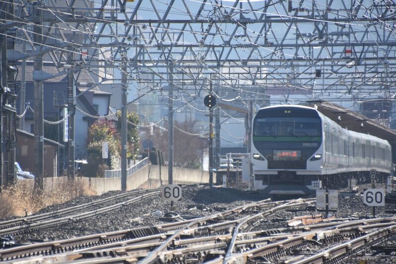 写真5枚目は、更に続けて、塩尻駅へと入線して行く所です。