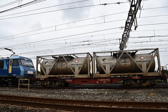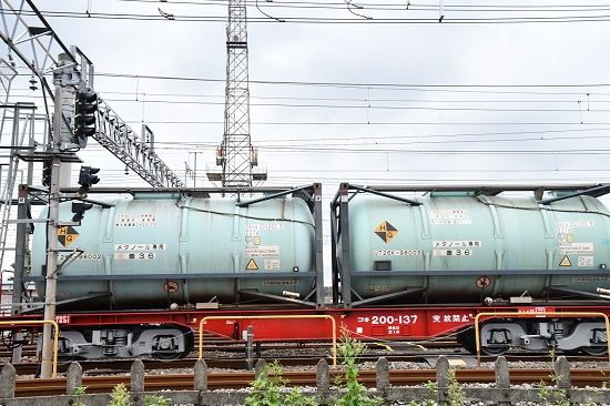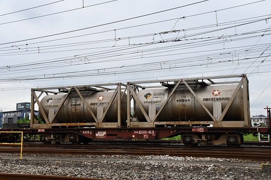 写真3枚目は、牽いているのは、昨日と同じく、コキ200に載る希硝酸のタンクコンテナ UTC14Cですが、日産化学所有の私有コンテナです。