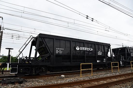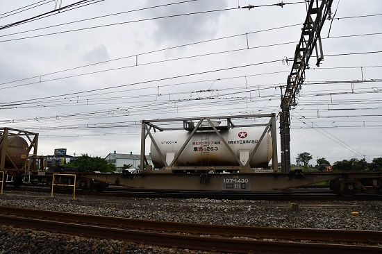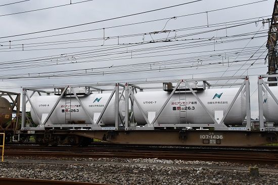 写真4枚目は、さらに、こちらのコキには液化アンモニアのタンクコンテナ UT10Cが載っています。こちらも、日産化学所有の私有コンテナです。