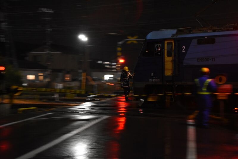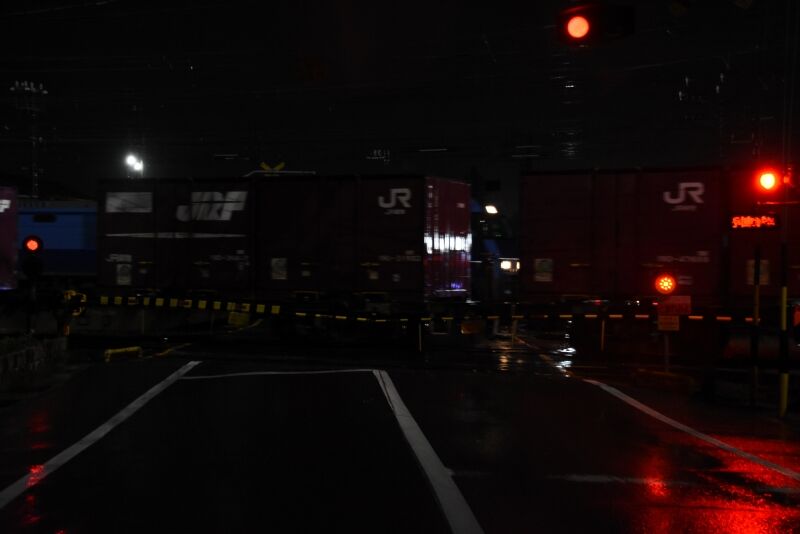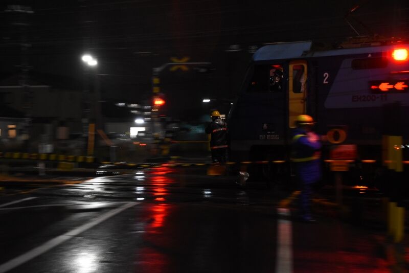 写真4枚目は、操車係に誘導されて、ようやく側線から本線を横断して行く、EH200-1号機です。