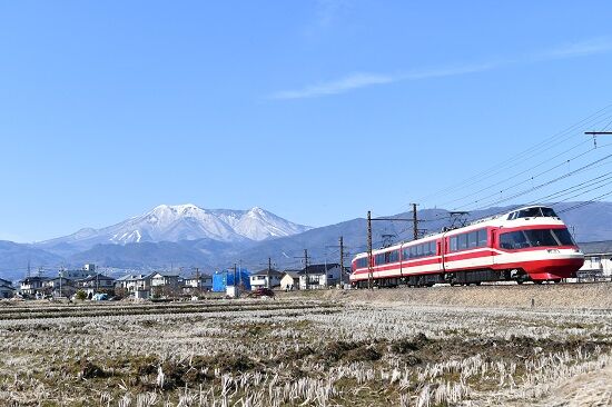 写真1枚目は、列番 7A 2100系 E1編成による「スノーモンキー」を、飯縄山をバックにて撮影です。