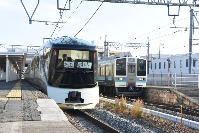 写真2枚目は、続けてE001系「TRAIN SUITE 四季島」と、2530M 211系 N607編成による「快速」との並びです。