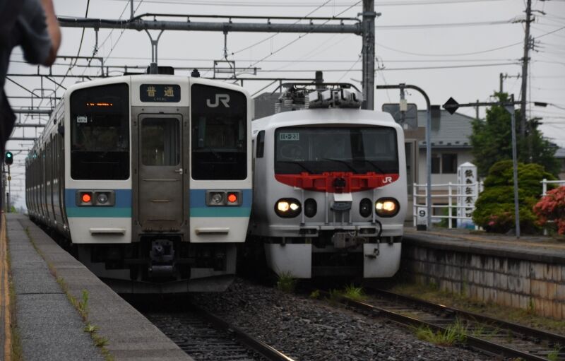 写真3枚目は、追いかけて信濃常盤駅に停車しているE491系 East i-Eにて、クモヤE491-1側からの撮影です。