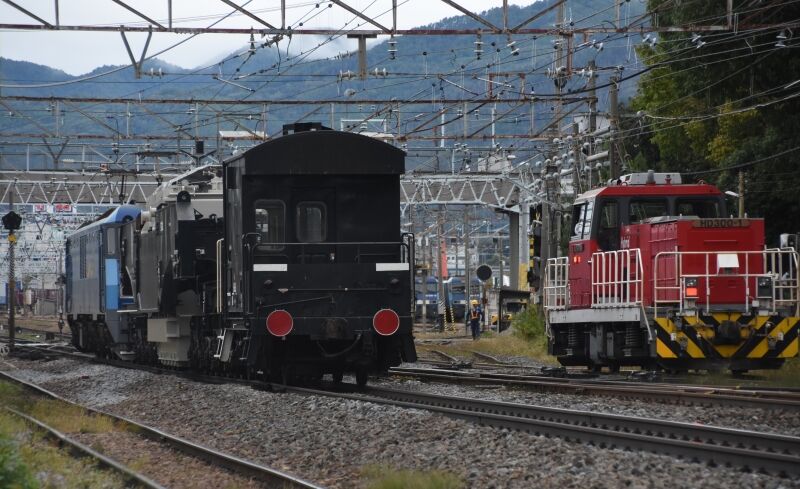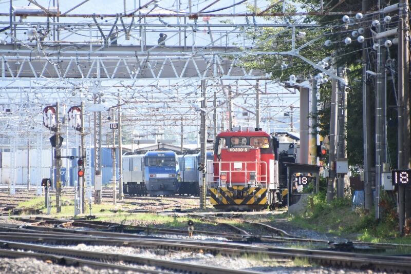 写真1枚目は、EH200-7号機が牽く特大貨物 シキ801+ヨ8629が到着すると、側線に待機していたHD300-1号機がお迎えに向かいます。