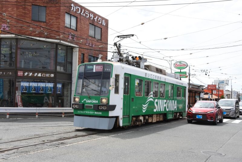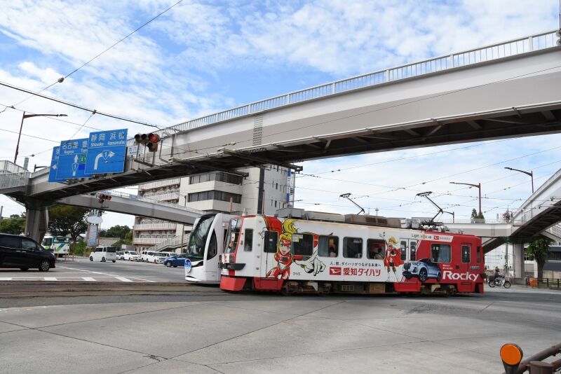 写真5枚目は、モ780形のモ785とT1000形 ほっトラムがカーブですれ違ったところです。