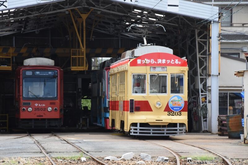 写真2枚目は、終点の赤岩口の車庫には、モ3200形のモ3203とモ3500形のモ3502がお休みでした。