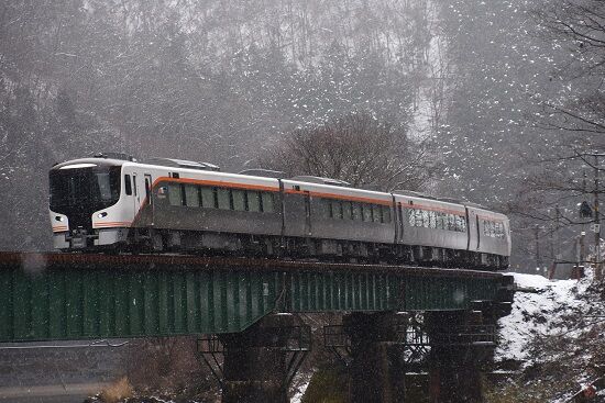 写真3枚目は、ようやく撮影が出来た飛騨細江先の鉄橋を行くHC85系の試運転です。