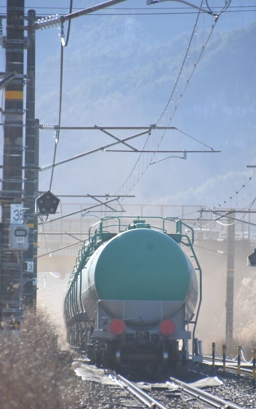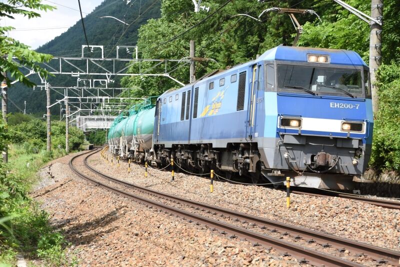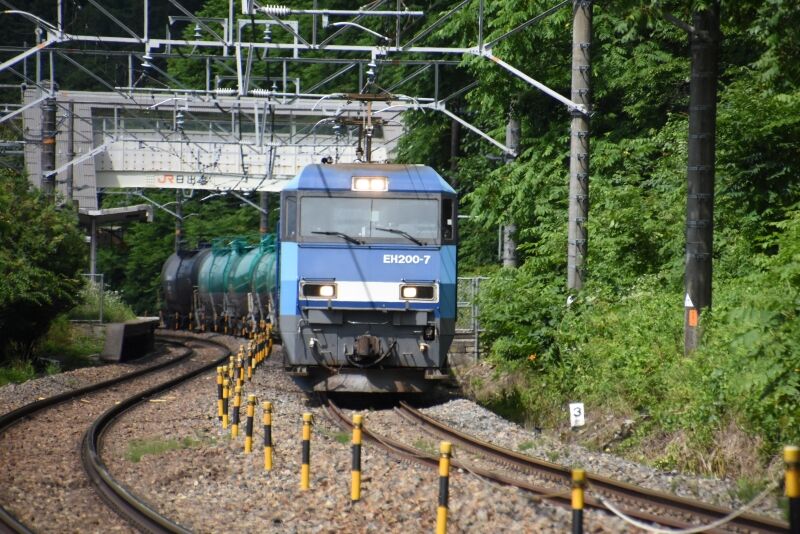 写真4枚目は、みどり湖にて、東線貨物2084レ EH200-8号機が定数いっぱの緑タキを17両牽いてです。
