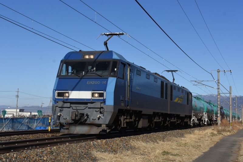 写真1枚目は、定番の塩尻→洗馬のストレートにて、西線貨物8872レ EH200-14号機が、タキ10両牽いてです。黒タキが1両挟まっているのが見えます。